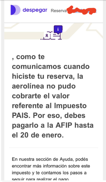 Anoche un amigo, Mati de Caballito, me mandó captura de un mail que recibió de Despegar. El compró un pasaje en los últimos días de 2019, cuando ya estaba vigente el impuesto pero las aerolíneas y agencias no podían cobrarlo aun