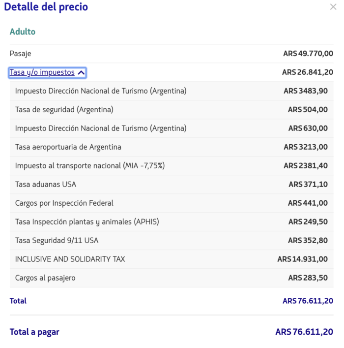 Aclaración: La incidencia del IMPUESTO PAIS es depende del destino mayormente y la composición de la tarifa con las tasas, no tanto de la aerolínea. Un pasaje a Madrid con Aerolíneas tiene igual una incidencia del 24% como el ejemplo de Latam a Miami