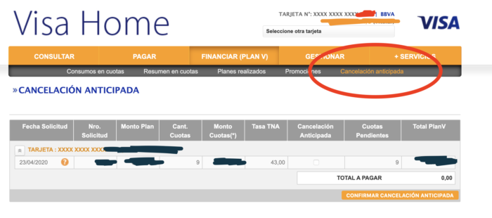 Muchos me consultaron sobre si se podía cancelar anticipadamente y por lo general eso es llamando al banco… pero hoy revisando VISA HOME veo que se lo considera un PLAN V normal y desde ahora ya se puede cancelar eso.