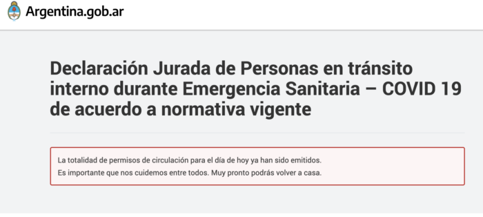 Hola Sir, te cuento que lo pude sacar el sábado a las 15 hrs. en una ventana que se abrió de nuevo por un rato nada mas. Durante la mañana de sábado me había sido imposible y ya estaba casi resignado. Pero por suerte de tanto darle al F5 logré entrar y sacarlo. Fui hasta Cba a buscar a mi señora que estaba allá. No pude ir antes de que decreten la cuerentena porque yo estaba con la cuarentena obligatoria de 14 días por retornar de Europa.