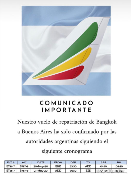 El día miércoles 20 de mayo se llevará a cabo un vuelo especial a la Argentina a través de Emirates, conforme el siguiente detalle: