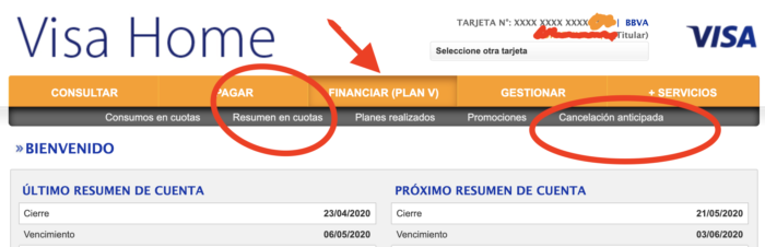 ¿Cómo se puede hacer la cuotificación de una tarjeta Visa? van a VISA HOME y ahí en Financiar PLAN V pueden ir a RESUMEN EN CUOTAS (dejo el cancelación anticipada para lo del final)