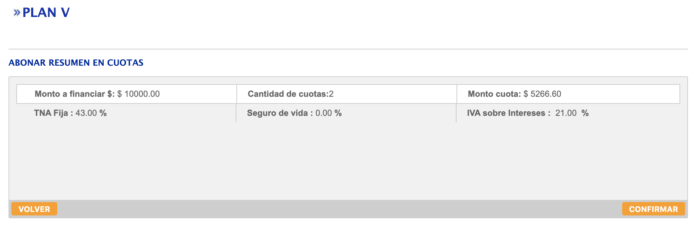 Acá el ejemplo de financiar 10.000 pesos en 2 cuotas