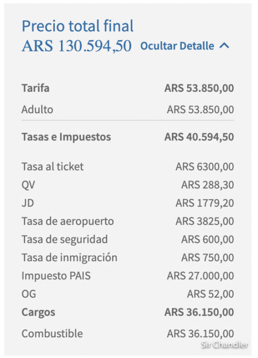 Una cosa que me pone un poco nervioso… El pasaje cuesta 53850. De tasas e impuestos hay 40594 (75%!!!!!). ¡Pero además te cobran 36150 de combustible!!!!! Digo… ¿El combustible no forma parte del pasaje?