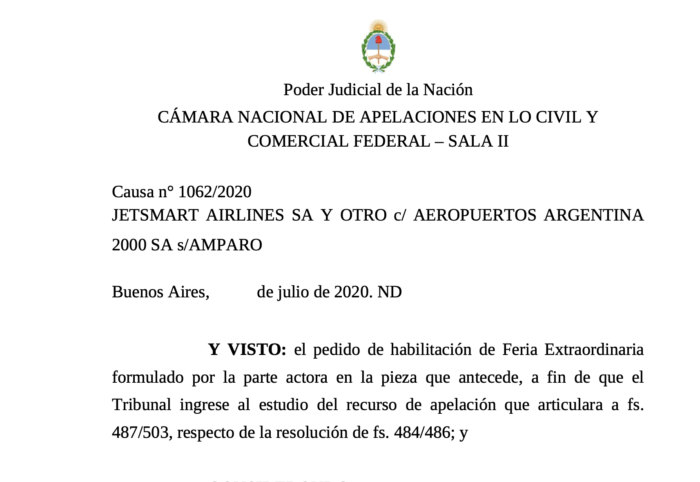 Por las razones expuestas, el Tribunal RESUELVE: habilitar la feria extraordinaria revocar la resolución apelada y conceder la medida cautelar solicitada. En consecuencia, se ordena a Aeropuertos Argentina 2000 a que: a) se abstenga de impedir el acceso a las firmas actoras al uso indistinto de las bases de operaciones y amarres que Norwegian Air Argentina S.A.U. –NAA- posee en el Aeropuerto Metropolitano Jorge Newbery; y b) deberá procurar actualizar sus registros de forma tal de reflejar en los amarres otorgados a NAA el reemplazo de la flota de aeronaves Boeing 737-800 matrículas LV-HQH, LV-IZQ y LV-ITK de NAA por la flota de aeronaves Airbus A320 de Jetsmart Airlines S.A. –JES- matrículas LV-IVO, LV-HEK, LV-HVT y LV-IVN, bajo la caución real fijada.
