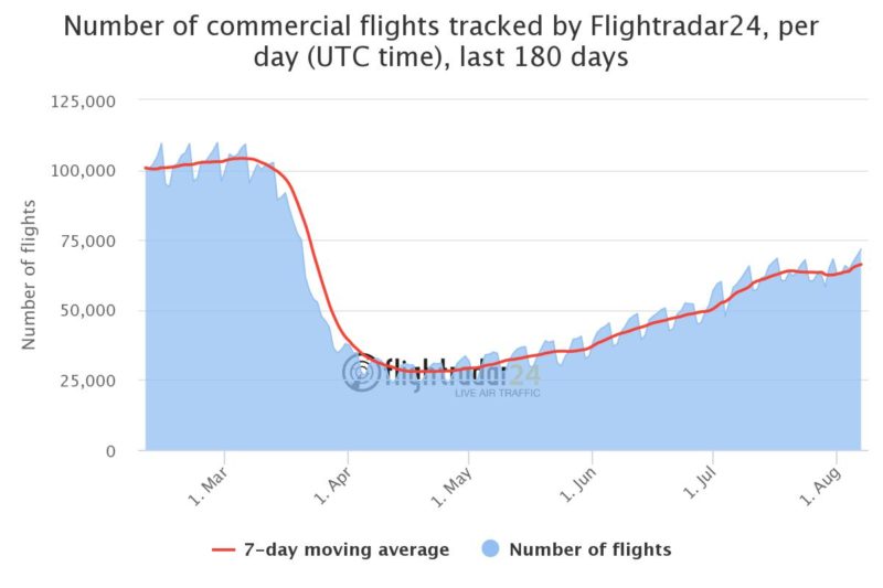 Y este viernes 7 agosto ya hubo 71.661 vuelos, un 34,7% menos que la mejor marca de febrero. Pero claramente esto debe ser por los vuelos del hemisferio norte donde se empezaron a mover más.