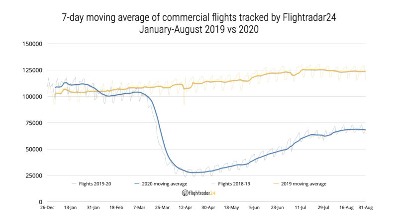 74.846 vuelos comerciales trackeados por Flightradar24 marca, y si bien no tienen todos los vuelos registrados siempre sirve para ver la tendencia