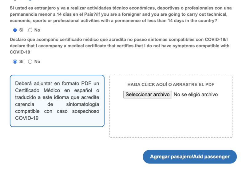 Y está la opción de SI UD ES EXTRANJERO… pero va a estar menos de 14 días… y ahí habilita el DECLARO QUE TENGO CERTIFICADO MEDICO
