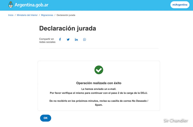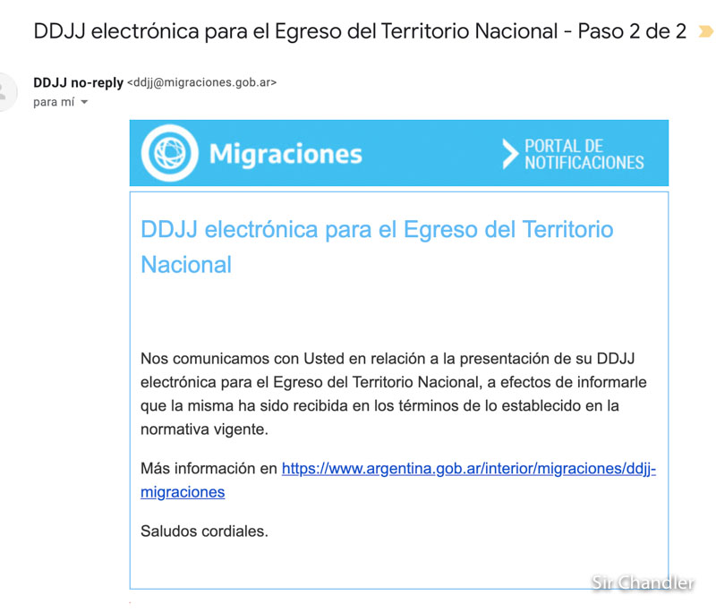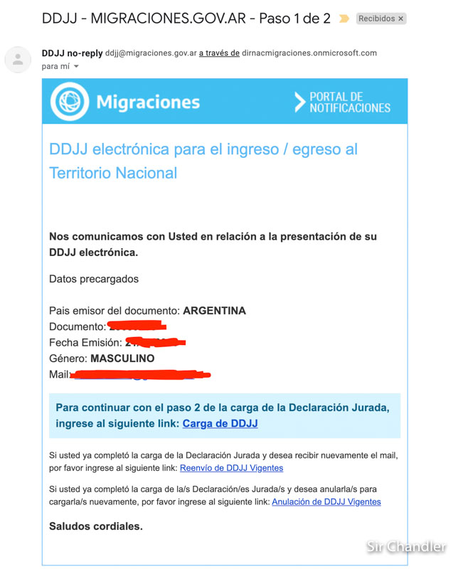 hola consulta.hoy domingo llene los datos y no recibi a mi email , ni estan en spam como mencionan el paso 2 para llenar la declaracion jurada y el martes 13 viajo a argentina . no se que hacer y , no contestan telefonos .gracias