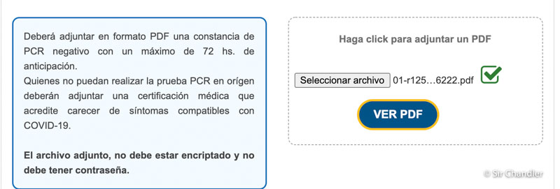 Acá se ve que marcaba que tenía el PDF que yo cargué y reitero algo que genera confusión es un MAXIMO DE HASTA 72HS DEL COMIENZO DEL VIAJE HACIA LA ARGENTINA. No 72hs de llegar, no 72hs de tener el resultado. Si el vuelo sale hacia la Argentina un jueves a las 10am, tienen que hacerse el test DESDE EL LUNES A LAS 10am. Si se lo hacen el martes está ok… pero ¿Llegan con los tiempos? Eso tiene que revisar, y obvio si se lo dan rápido, sirve el miércoles también (para el ejemplo del jueves) Y tiene que ser PCR (no antígenos) y se lo hacen los mayores de 6 años