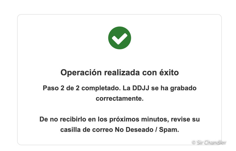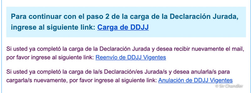 Al completar esa primera parte, que es corta te avisa que vas a recibir mail donde validan la dirección. Entiendo que muchos tuvieron problemas con ese paso por lo que no podemos saber si es por falla de dirección de mail o por caída del sistema. Pero esto es lo que llega al mail (tardó un minuto aprox) diciendo que tenés que hacer el paso 2 (y están los links de anulación de las DDJJ previas o reenvío de lo que hiciste