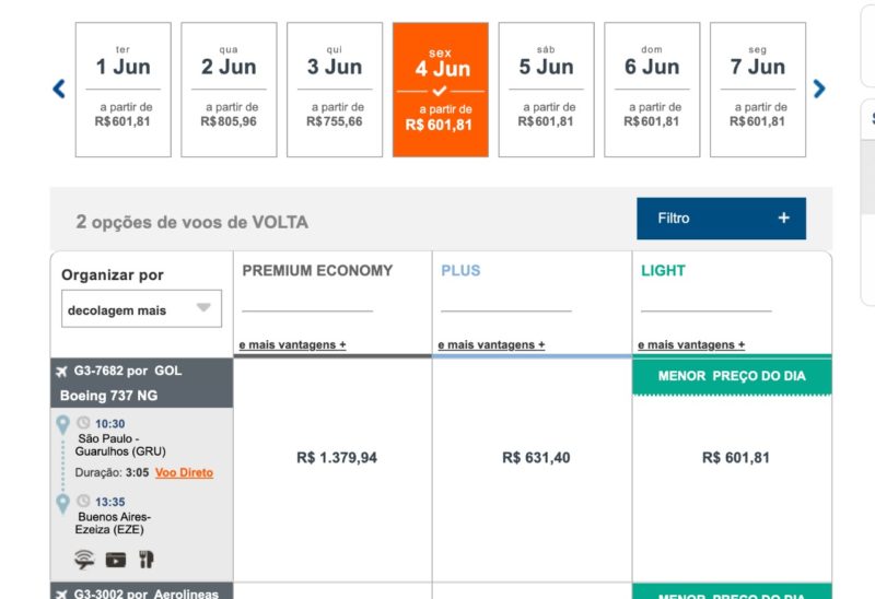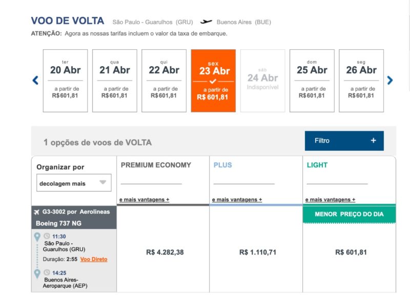 La aerolínea de Brasil iba a volver a fines de marzo, pero si hoy uno hace búsquedas de vuelos en su sitio todos los resultados de abril y mayo son operados por Aerolíneas Argentinas, con quienes tienen código compartido