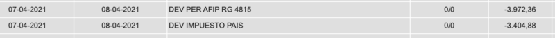 Y luego apareció en el resumen, con la misma fecha, aunque no haya sido inmediato, la cancelación de los dos item, la AFIP RG 4815 que es el 35% y el PAIS que es el 30%