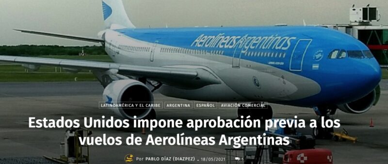 Estados Unidos impone aprobación previa a los vuelos de Aerolíneas Argentinas, así titula el mejor portal de aviación de Latinoamérica en esta nota https://www.aviacionline.com/2021/05/vuelos-estados-unidos-aerolineas-argentinas-dot-aprobacion/