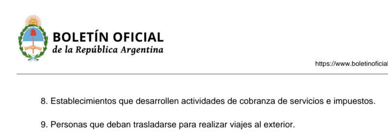 En el DNU publicado en el boletín oficial el punto 9 del artículo 5º indica que las personas que deban trasladarse para realizar viajes al exterior tienen el permiso de movimiento, SIN EL USO DE TRANSPORTE PÚBLICO