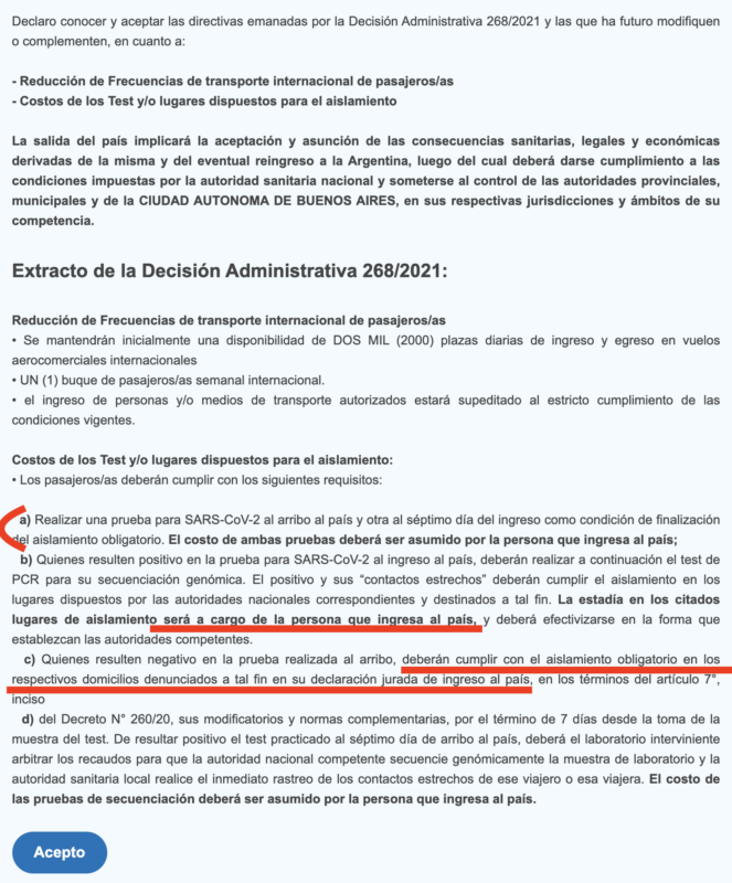 Cuando llega el mail con la confirmación de todo esto, en la segunda etapa del llenado es que pusieron todo este texto que habla de los testeos, los costos de esos y el aislamiento obligatorio. Tampoco aparece lo de repatriación