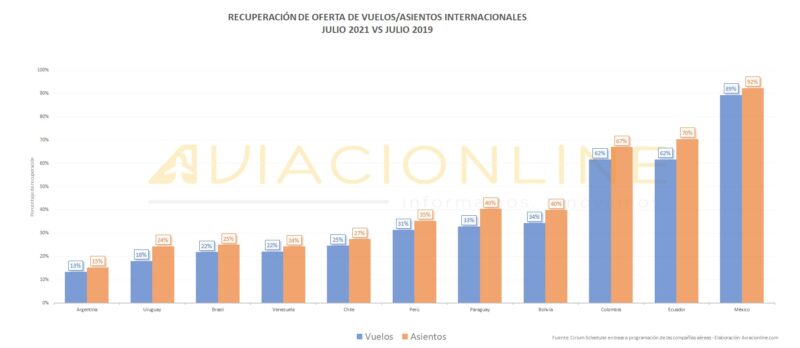 Argentina tentrá en julio 2021 un 13% de los vuelos internacionales que tenía en julio 2019. Mientras que Bolivia está en un 34% o Venezuela en un 22%.