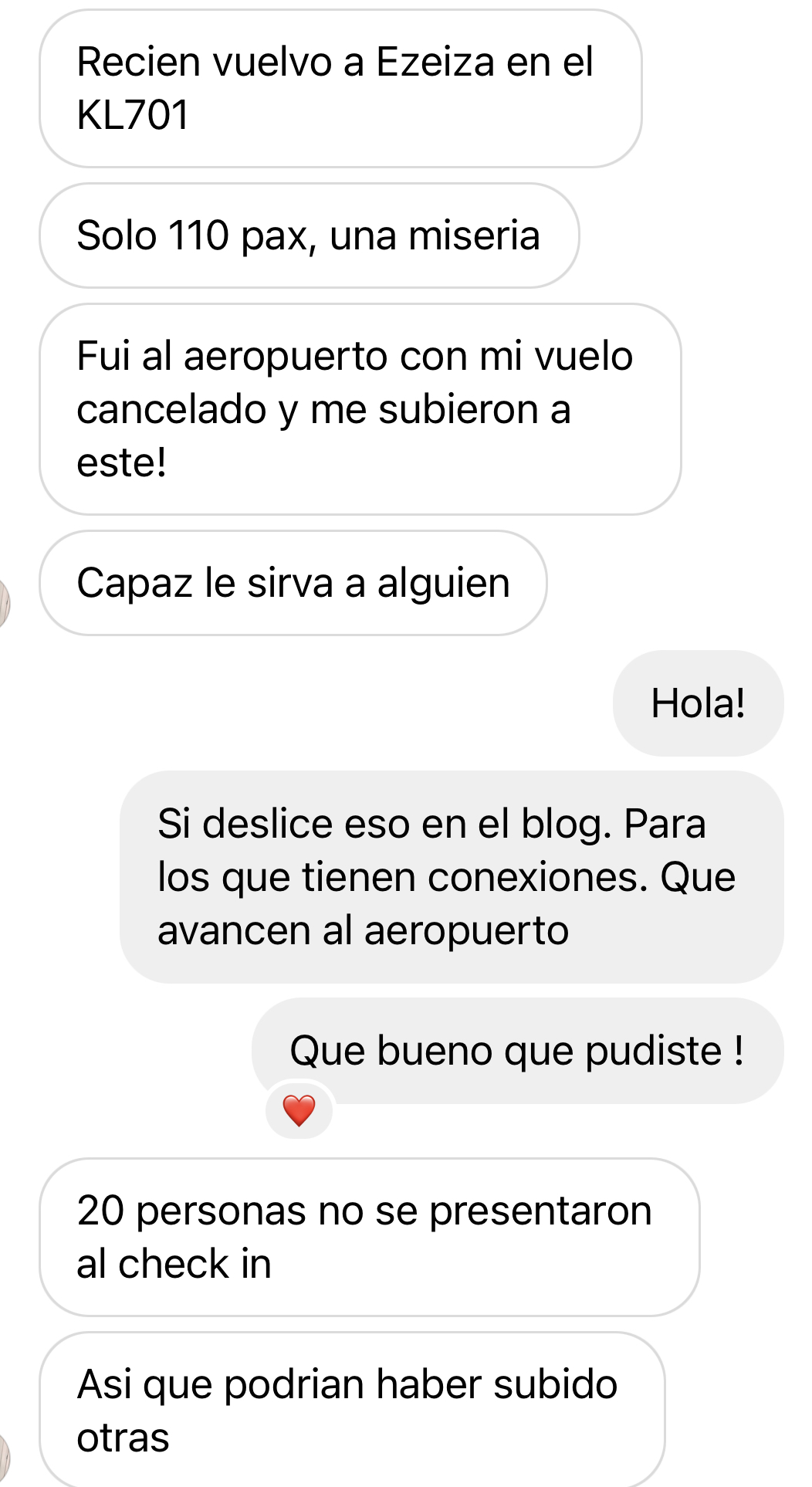 Hola Sir… Llegué hoy 21 en el KL 701. Yo hacía Valencia Ams Bs As. El 701 hizo un vuelo partner con uno de Aerolineas Argentinas. Aparentemente cada vuelo venia con muy poca gente por eso los juntaron. Así y todo mucho lugar libre. De hecho muchos aprovechamos y usamos fila completa de asientos para dormir.