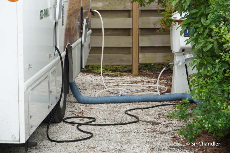 En esos campings uno se conecta a la energía, el agua y la cloaca. Sobre este temita hablo claro en el video y muestro el proceso, que es resimple y lógico. Porque tiene dos depósitos, el de aguas negras y grises…. primero se liquida el de negras y luego el de grises (agua con detergente, jabón, shampoo…) limpia el caño.