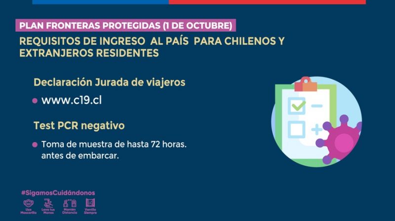 Chile informó que desde el 1º de octubre podrán entrar extranjeros no residentes VACUNADOS al país, por lo que se levanta el cierre de fronteras.
