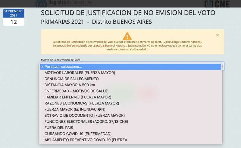 Hay uan web para justificar el no voto en las elecciones de hoy con distintos motivos y figura el estar fuera del país, estar cursando el covid o estar en aislamiento preventivo, que puede ser el caso de los que volvieron al país.