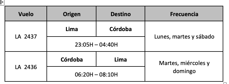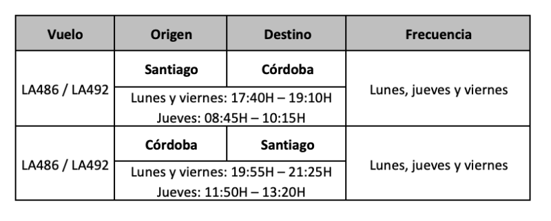 Latam, que está demorado en confirmar sus vuelos en estas horas por operar desde distintos aeropuertos y distintas filiales, envió ya la programación desde Córdoba que arranca a mitad de noviembre.