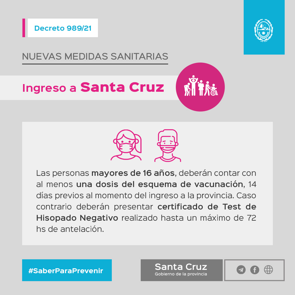 Hola Sir! Para entrar a Santa Cruz desde Comodoro en auto, te piden el certificado de vacunación en el puesto Ramón Santos. Si no lo tenés, te haces el test en el mismo lugar, lo cubren todas las obras sociales y en 20 minutos está el resultado (no ir en hora pico, tipo 13 o 17 porque van a estar un buen rato más!). Espero que sirva mi aporte! Gracias por toda tu info!!