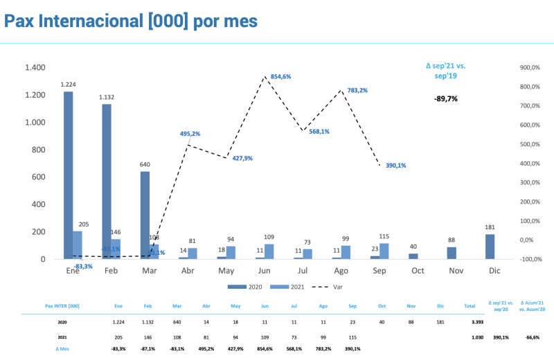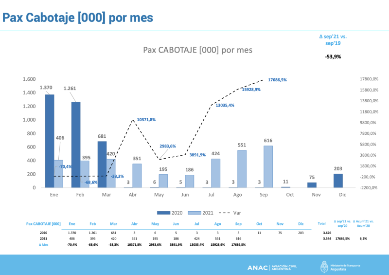 Revisando el de septiembre 2021 podemos ver que hubo 616.000 pasajeros de cabotaje, contra los 551.000 que hubo en agosto. Y marzo que había sido bueno, tuvo 420.000. Pero con la segunda ola en junio bajó mucho