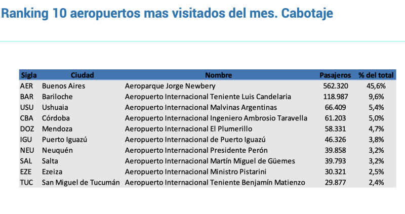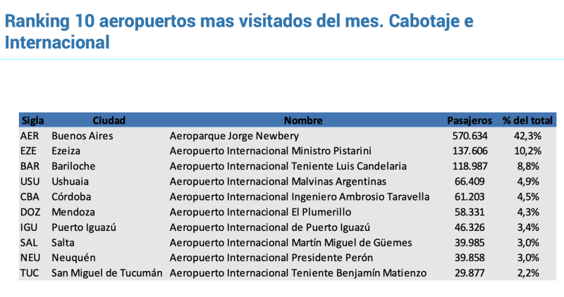 Detalle acá con el ranking de aeropuertos, con Aeroparque teniendo más de medio millón de pasajeros, seguido por Bariloche, luego Ushuaia y recién en el 4º lugar Córdoba
