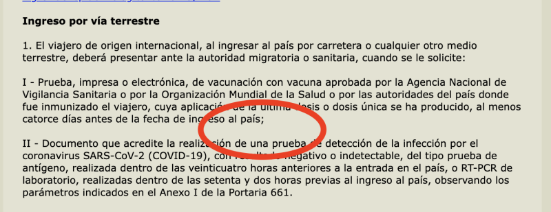 Sir Chandler, ojo que el consulado no refleja exactamente lo que dice el decreto del gobierno para ingreso por vía terrestre. El número 661 (portaria interministerial 661) del 8 de diciembre dice vacuna o PCR/antígeno pero el 20 de diciembre sacaron otro, (portaria interministerial 663), que directamente habla solo de vacuna y ni menciona un test. Yo creo que leer la legislación es lo más seguro. ¿Vos qué opinás?