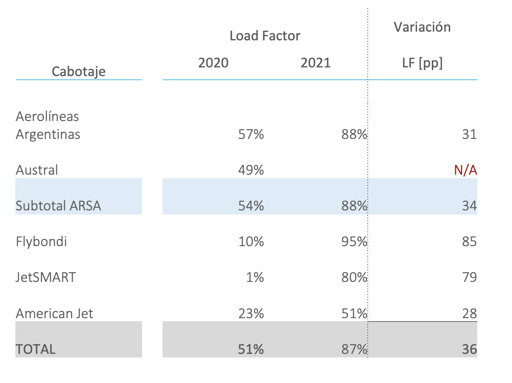 Veamos lo de la ocupación, que si bien en esa parte del cuadro parece que es de todo el 2020 o 2021, se refiere puntualmente a la del mes de octubre de cada año. Jetsmart y Flybondi no volvieron en octubre 2020
