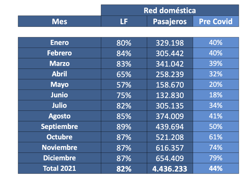 El año en general terminó con 4,4 millones de pasajeros, un 82% de ocupación y una operación total del 44% en relación a la pre pandemia