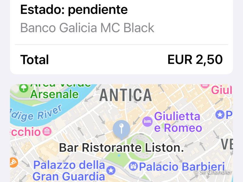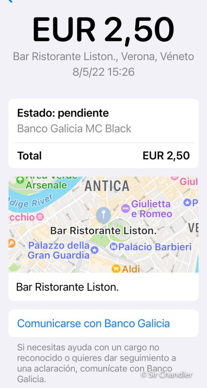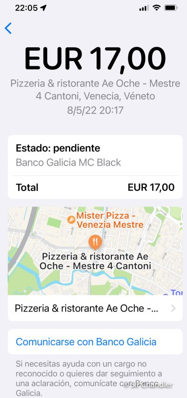 Ahora si uno entra en esa alerta del banco galicia, es parte del wallet y se ve este detalle con el horario, la dirección y el mapa del lugar. Estimo que info cruzada con lo que aparece en apple maps para dar esa precisión