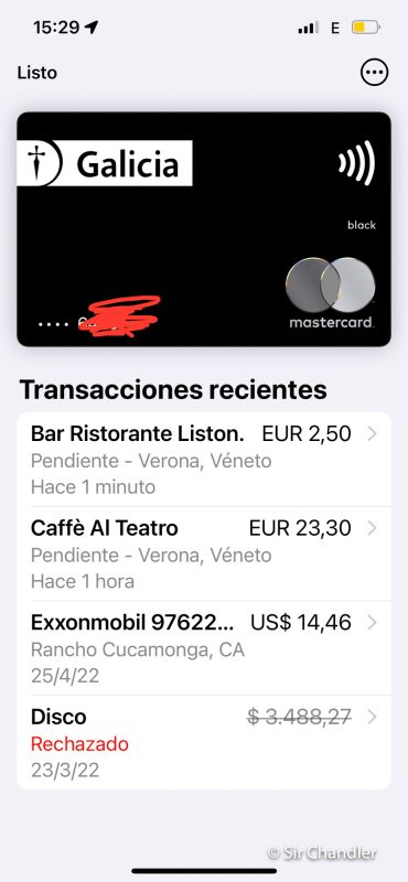 Donde se ve que con el CELULAR hice esos pagos… uno rechazado en Disco de Buenos Aires (creo que falta que ellos habiliten algo), otro en una estación de servicio en California (rancho CUCAMONGA!!) y los dos en Italia con el celu… porque los que uno hace con el reloj aparecen en la app del reloj en si.