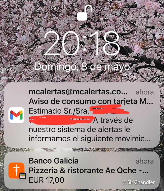 Paso a explicar entonces la imagen de arriba, que no recuerdo haberla visto cuando arrancó el sistema con el Banco Galicia. Ni bien uno hace la compra salta una alerta de que se hizo la compra… con ese mismo dispositivo. No entiendo bien la chance de estafa al respecto, pero es bueno que esté el aviso. Y como muestro en esta imagen de abajo al mismo tiempo llega el mail de Mastercard avisando el consumo. Anda muy rápido