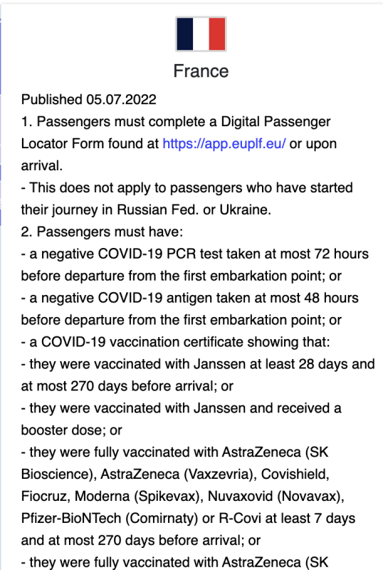 Como comenté hace algunas semanas Francia puso que pedía un formulario… pero en algo que actualizó IATA hace un par de días dice lo del formulario que se mantiene en pie, pero además de vacunas o recuperados o antígenos o pcr…