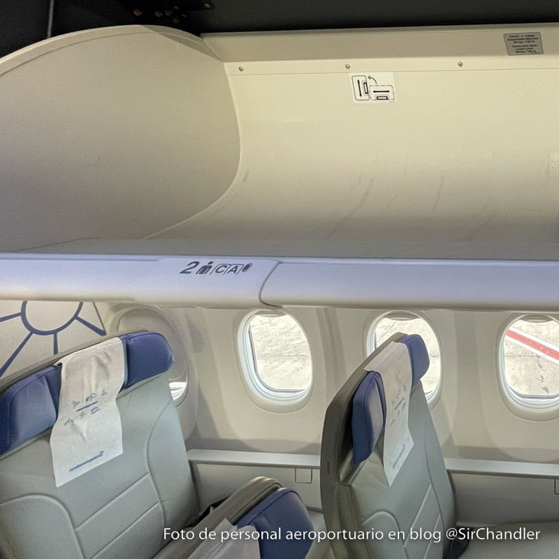 Pero su interior obviamente quedó como lo pidió la aerolínea y lo hace diferente al resto de los Max que tiene Aerolíneas, que son 5. Esta foto pasada por personal aeroportuario muestra en la parte de club economy por un lado que los asientos son más finitos, algo que también se repite en turista, pero el punto del post es lo del equipaje en los gabinetes, que tiene una discreta señalización de que pueden ir parados de costados las valijas.