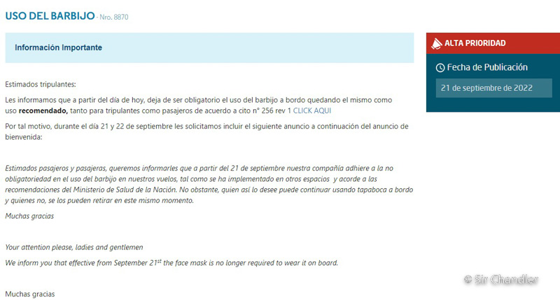 El proceso de información al personal de embarque es bastante deficiente. Hace poco discutí con un empleado de AR en puerta de embarque porque no me dejaba embarcar prioritario con categoría Gold, ya que él argumentaba que era solo para Platino. Le mostré la web de Aerolíneas y aún así insistía en que eso se lo habían enseñado en un entrenamiento que había tomado una semana atrás. En el fondo no me importaba demasiado embarcar antes, pero me molestó la falta de información en cosas tan básicas. Al final del día es como si cada uno hiciera lo que se le da la gana sin directivas generales. Claro, con el tiempo todo se va homogeneizando, pero imagino que los primeros días sin barbijo van a ser complicados/divertidos.