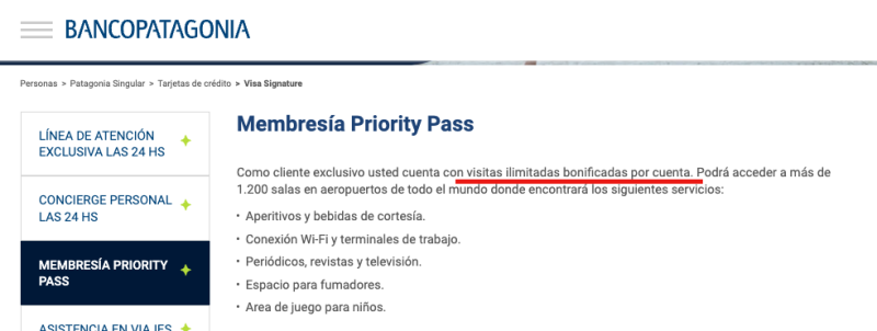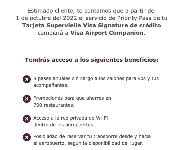 «Queremos informarte que, hasta el 30/09/2022, se encontrará vigente el servicio de Priority Pass para las tarjetas de crédito: Visa Signature, Visa Access Now Platinum y Visa Access Now Black.
