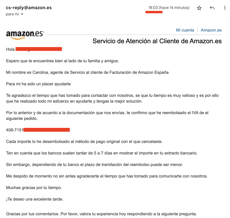 Hace unos días recordé que no había concluido el trámite de devolución de IVA de una compra hecha en Amazon ESPAÑA en octubre pasado. Por lo que mandé el mail como es habitual a [email protected] pidiendo eso, sin los requisitos habituales… para ver que estaban pidiendo ahora.