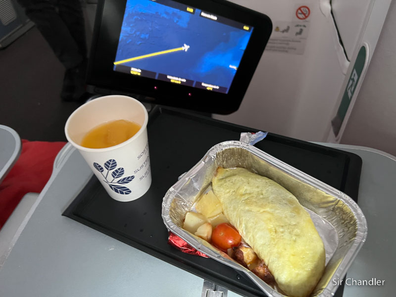 El desayuno con omelette, también en otro recipiente, ahora aluminio. No se si es por la eliminación de plásticos de un solo uso.