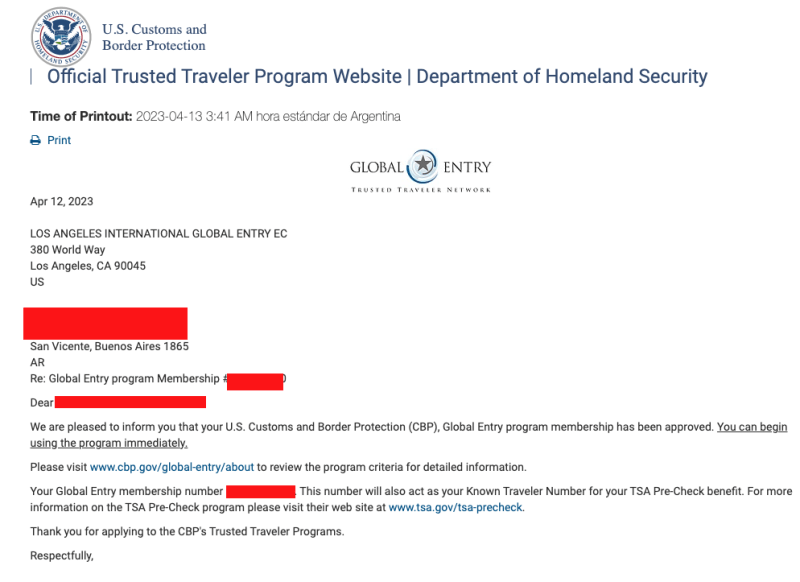 Después conviene poner el número de aprobación (PassID) en las reservas de las aerolíneas, para que la incorporen en las tarjetas de embarque, ya que Global Entry incluye TSA Precheck (o sea, paso rápido por la seguridad de los aeropuertos estadounidenses).