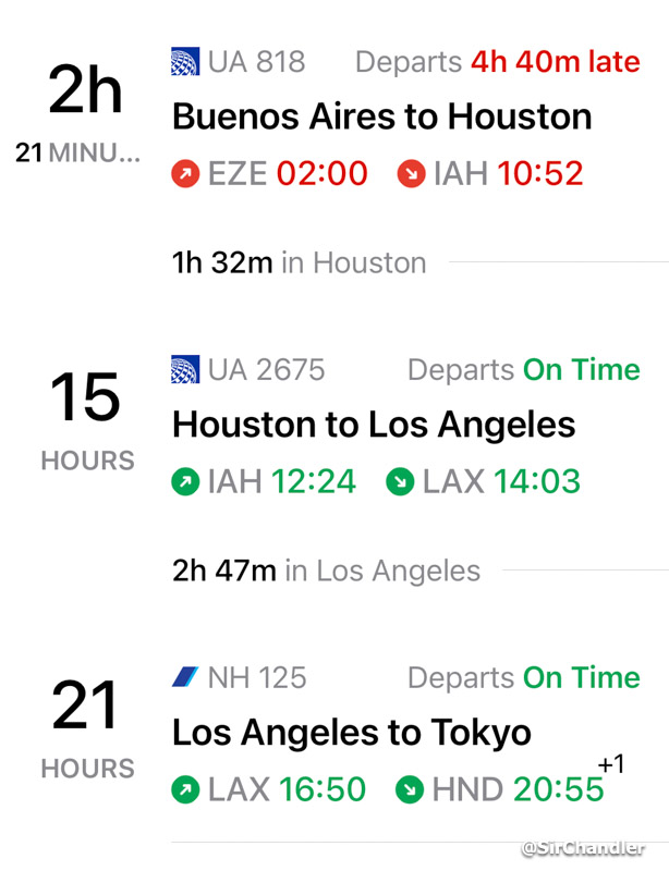 Así quedaron los vuelos entonces en captura de la app de FLIGHTY. Dato de color ahí cuando hice la captura solo figura con demora el primero, pero por suerte el segundo también se demoró media hora lo que me dio más aire en Houston. Y finalmente el de ANA también habrá tenido unos 20 minutos de demora.