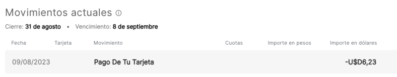 Pero confirmo que en el momento el sistema indica que se cancelaron los usd el 9/8, o sea hoy, siendo que la tarjeta cierra el 31 de agosto