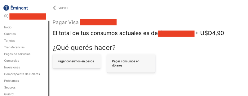 Ahí se ve que tengo USD 4,90, seguro de alguna suscripción. Pongo PAGAR CONSUMOS EN DOLARES y al entrar me dice pagando desde la CAJA DE AHORRO EN PESOS