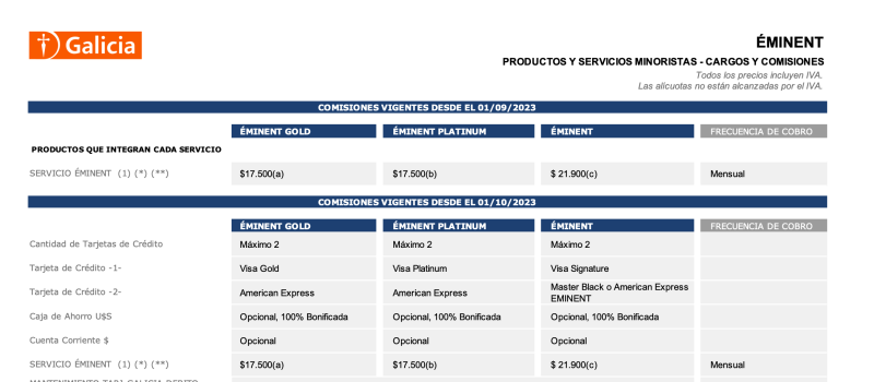 A priori el Galicia quedó más caro que el Santander, pero acá lo recibido que en ambos casos tengo el paquete black.