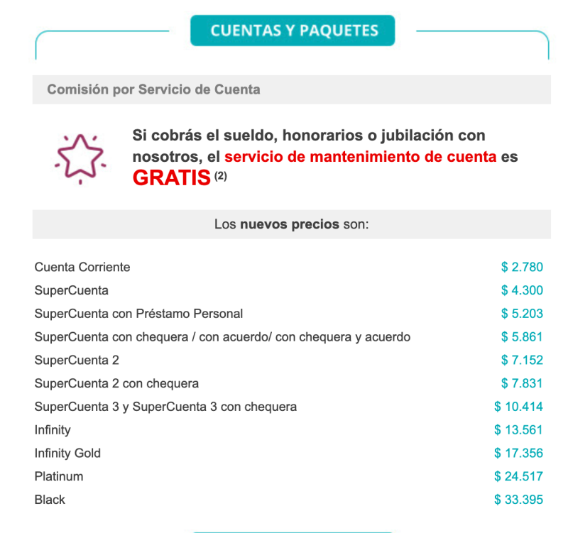 (2) Consiste en la bonificación del 100% del valor de tu paquete (“comisión por servicio de cuenta”). Para honorarios únicamente válido si el empleador es cliente del banco y paga desde una cuenta en Santander a través del módulo de pago de sueldos/honorarios y no como concepto transferencias/honorarios. Promoción válida hasta el 31/12/2024 o hasta el cese de acreditaciones de haberes u honorarios en el Banco, lo que suceda primero. En ese caso, se deberá abonar el precio actualizado vigente en dicha fecha. Renovable a opción del Banco. Te recordamos que la cuenta en que se acreditan haberes (Cuenta Sueldo) no tiene costo alguno en cuanto a su constitución, mantenimiento o extracción de fondos en todo el sistema bancario, hasta el monto derivado de las remuneraciones y/u otros conceptos derivados de naturaleza laboral, cualquiera fuera la modalidad extractiva empleada, mientras se verifique el cobro de sueldo, u honorarios y en la medida que perdure la relación laboral con el empleador, de corresponder.
