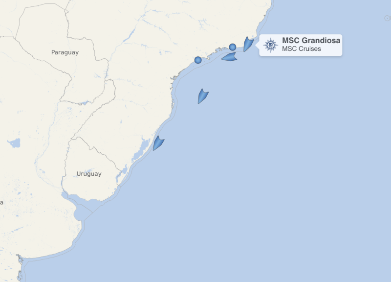 Ya en el viaje me enteré que los brasileños, además de ser millones… usan mucho los cruceros. Y que MSC tiene muchos cada verano por esos lados. Acá dejo una captura de un sitio que me pasaron lectores hace unos días que permite filtrar los barcos de una naviera que muestra a los 6 barcos que había esta mañana en aguas de Brasil