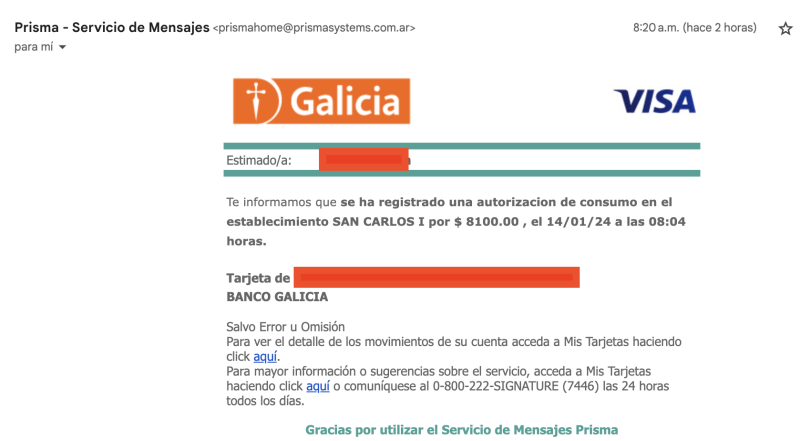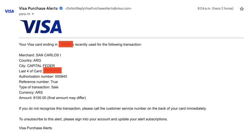 Y a las 8:20 llegó el de Visa Argentina vía Prisma. Vean que en el detalle dice que la compra se hizo 8:04 pero el mail es de 8:20