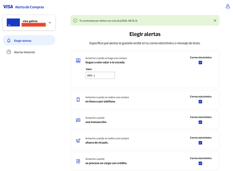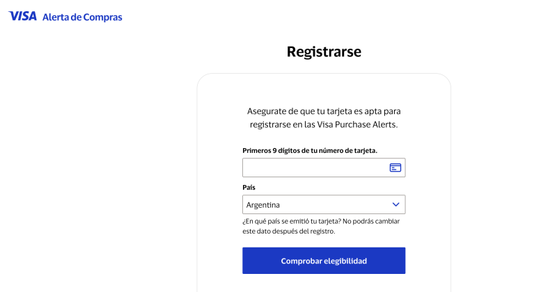 Volvamos a VISA PURCHASE ALERTS, el sitio es https://purchasealerts.visa.com/vca-web/check